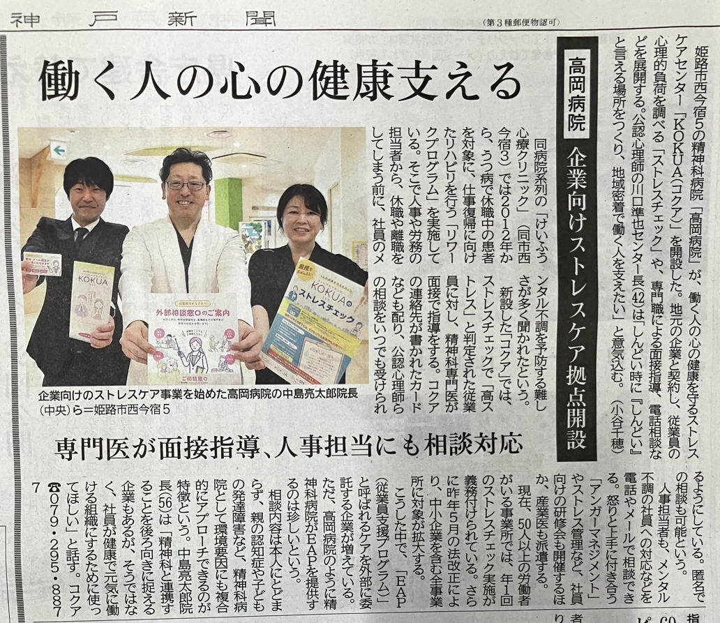 4月8日(水)の神戸新聞にストレスケアセンター「KOKUA」が掲載されました。